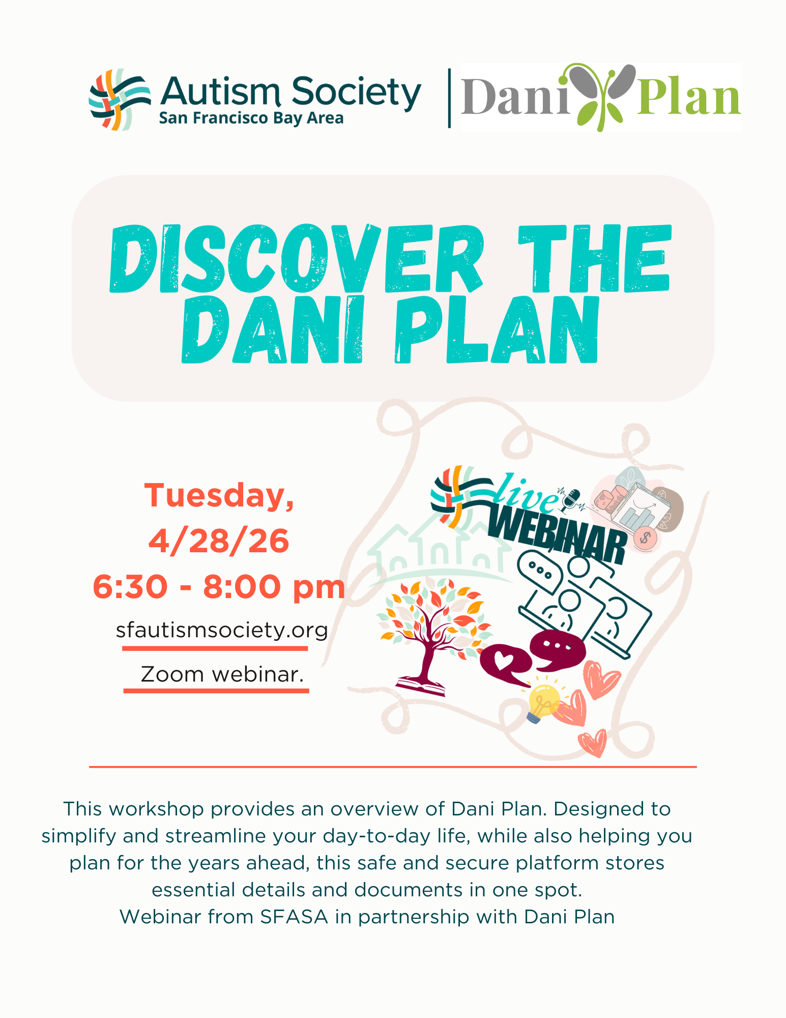 Autism Society San Francisco Bay Area is partnering with Dani Plan! Join us for our April webinar to learn about managing the essential details of your loved one’s care. Dani Plan offers a secure cloud-based software solution as a valuable resource to help you organize and consolidate important information – ensuring that nothing gets lost in the shuffle of daily life.